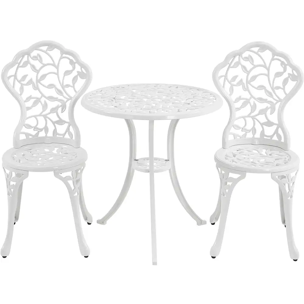Our elegant patio bistro table set is suitable for most outdoor settings or events. Natural & vintage design with floral-petal-shaped back add more antique charm to your designated place; sturdy aluminum ensures this patio bistro table set is sturdy and durable; oxidation-resistant and the water-proof coating does not fade easily; Armless chairs serve more space for free movement; adjustable foot pads assist adjust and control the balance of chair according to different patio condition. Our outdoor dining table set can be placed in most outdoor events such as an outdoor wedding ceremony. patio setting for cafe and so on.